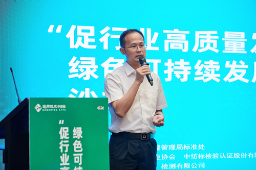 深圳市市場(chǎng)監(jiān)督管理局標(biāo)準(zhǔn)處副處長(zhǎng)徐均偉在致辭中表示,深圳市場(chǎng)監(jiān)督管理局標(biāo)準(zhǔn)處致力于推動(dòng)高標(biāo)準(zhǔn)和質(zhì)量,同樣也注重企業(yè)對(duì)環(huán)境和社會(huì)的責(zé)任,鼓勵(lì)和支持企業(yè)推動(dòng)綠色轉(zhuǎn)型。他代表標(biāo)準(zhǔn)處感謝中紡標(biāo)搭建溝通交流平臺(tái),發(fā)揮權(quán)威檢驗(yàn)檢測(cè)機(jī)構(gòu)的影響力,匯聚合力幫助企業(yè)完成綠色轉(zhuǎn)型。“路雖遠(yuǎn),行則將至,事雖難,做則必成”,他同時(shí)呼吁更多的力量加入到“雙碳”行動(dòng)中來,助力行業(yè)實(shí)現(xiàn)綠色發(fā)展。