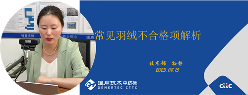 8月15日,由通用技術中紡院中紡標檢驗認證股份有限公司(以下簡稱“中紡標”)和國家紡織制品質量檢驗檢測中心聯合主辦的2023'CTTC中紡標云課堂線上培訓成功舉辦。中紡標檢測事業部技術部技術負責孫靜與深圳公司質量技術部負責人劉鵬分別在北京、深圳兩地攜手,與近200家紡織服裝企業相約“云”上,共同開啟本次培訓。