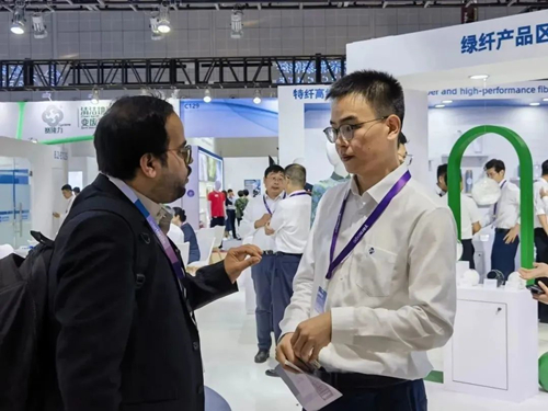 通用技術集團副總經理、黨組成員賈大風現場實地調研考察通用技術新材展團,詳細了解纖維新材料、化纖裝備制造與工程服務、紡織新材料、標準檢測與技術服務等業務板塊參展情況,并對此次展示的綠纖、特纖、高纖產品及制品的技術創新點和經濟效益及社會效益情況進行了深入溝通。