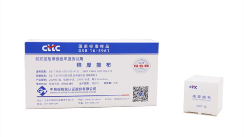 T/CNTAC RM 1-2019 《紡織品耐摩擦色牢度測試用棉摩擦布標準用品》( GSB 16-3631-2022)依據GB/T 33729-2017(ISO 105-F09:2009,MOD)《紡織品 色牢度試驗 棉摩擦布》研制,適用于GB/T 3920(ISO 105-X12:2001,MOD)《紡織品 色牢度試驗 耐摩擦色牢度》和GB/T 29865(ISO 105-X16:2001,MOD)《紡織品 色牢度試驗 耐摩擦色牢度 小面積法》,試驗時安裝在耐摩擦色牢度試驗儀的摩擦頭上作為摩擦布對試樣進行干、濕摩擦試驗。